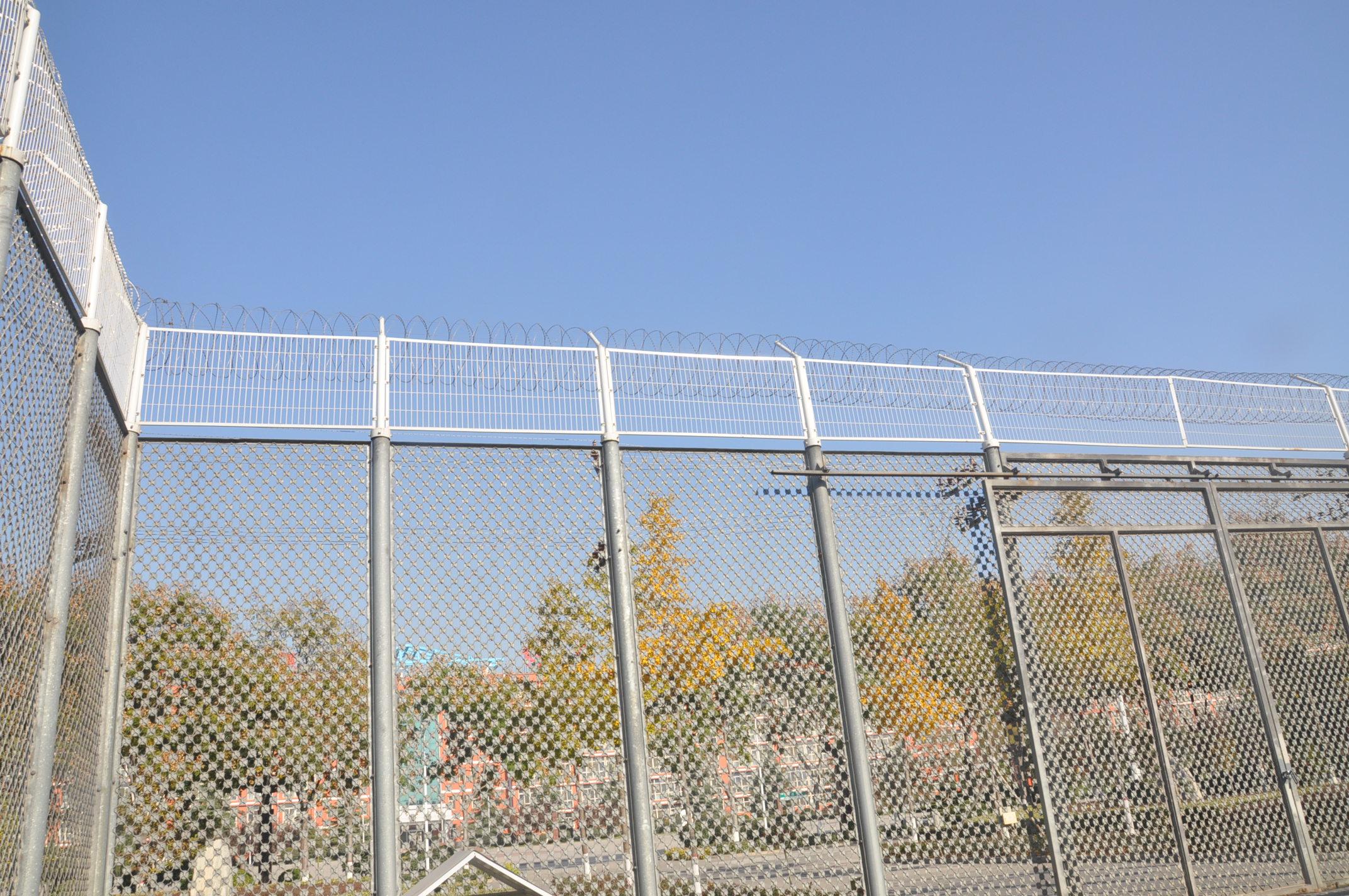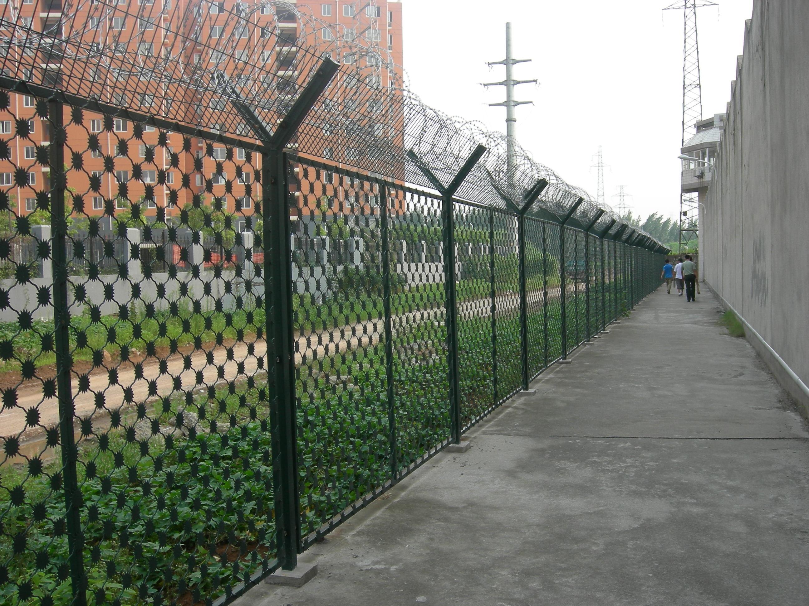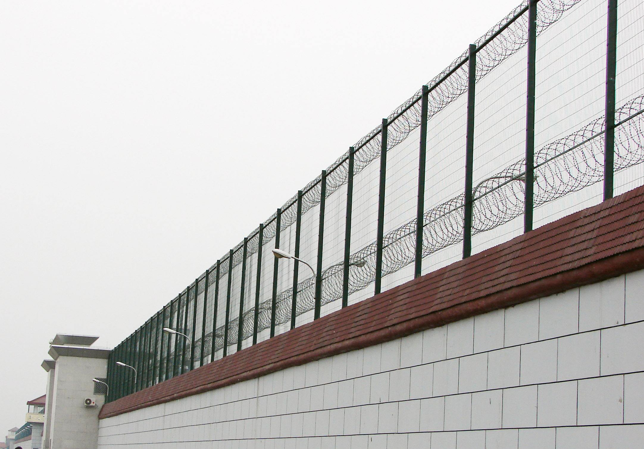 監獄鋼絲焊接的網片采用低碳鋼絲焊接而成,表面采用pvc浸塑處理,與刀刺網連接。安裝刀刺網的立柱采用6CM*6CM方管,壁厚在2-2.5MM,高2.4米,底部2米圍直線,上部0.4米向內折30度成斜線,立柱間隔為3米;橫梁采用4CM*2CM長方鋼,長3米為一個單位:立柱和橫梁表面涂黑綠色(注塑工藝),橫梁和立柱配有連接件。